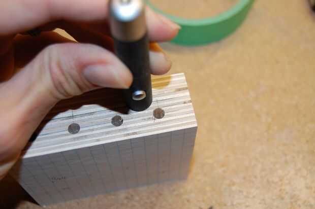El bloque del laser se construye de manera similar, con los punteros de láser espaciados para que coincida con los tubos de latón (2cm de separación). Este bloque fue un poco más difícil de hacer. El problema es los interruptores en los lasers - no he podido conseguir en las "entrañas" de los punteros láser, así que tuve que construir el bloque para sujetar el cuerpo del puntero láser y presione el botón al mismo tiempo. Lo hice por la primera perforación de un agujero más pequeño que el botón se deslice, entonces un agujero más grande para el cuerpo del laser. Desliza el puntero en el lugar y si tienes suerte, se pulsa el botón hacia abajo debido a las tolerancias apretadas. Esto sucedió sólo para dos de mi láser, así que tuve que añadir tornillos para bajar permanentemente. Taladre un orificio de 9/64" de acceso para cada botón en la parte inferior del bloque (medir con cuidado!) y tornillo 8-32 x 1/4" tornillos "empujar" los botones. Finalmente, Perfore tres agujeros avellanados para los tornillos de montaje. Asegúrese de que no taladrar los agujeros donde serán los lasers o los alambres!