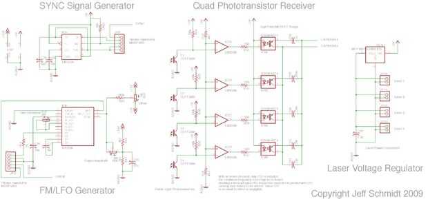 También se necesita un suministro eléctrico separado, que produce + 15, -15 y + 5V. Los láseres son conducidos por un regulador de 3V que "falsea" la tensión de que los láseres están esperando.