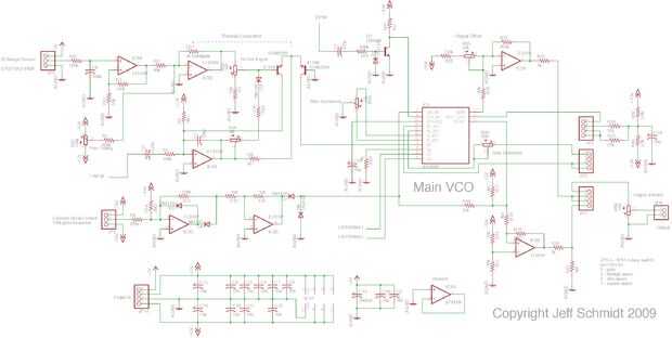 Me llevó a investigar varias posibilidades de oscilador (all-analógico). La simplicidad de este momento fue clave, ya que todo tuvo que caber dentro del cuerpo de la guitarra. Hay un número de oscilador controlado por voltaje solo chip ahi, pero el único que está realmente en la producción es el XR2206. Este pequeño dispositivo aseado lleva un control de corriente o voltaje y produce un seno, triángulo o cuadrado forma de onda que es proporcional a ese control. El control puede ser tan simple como un potenciómetro, o algo más complejo como el Distanciómetro infrarrojo utiliza. Durante mi búsqueda me ha pasado con un excelente diseño por Thomas Henry. Todo lo que necesitaba para empezar tenía.