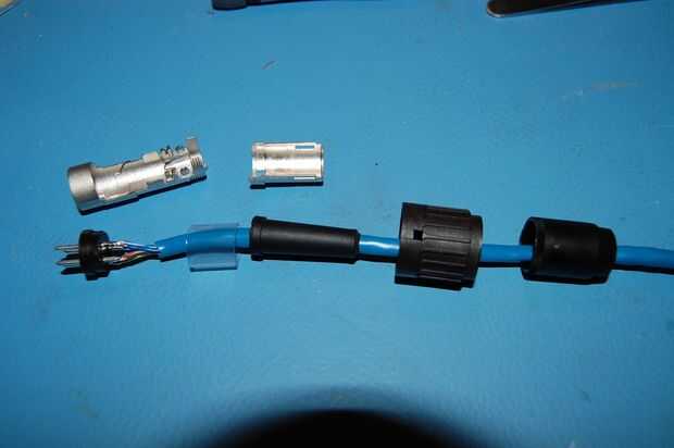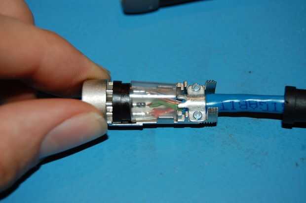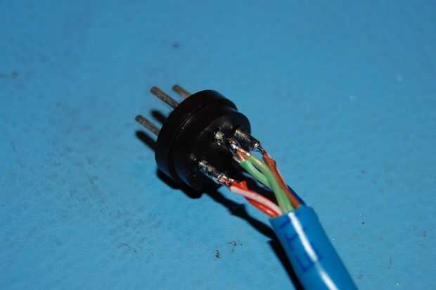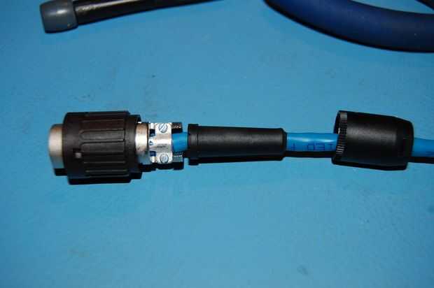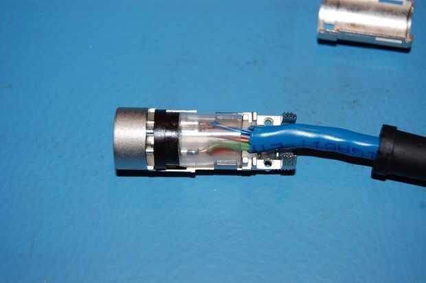 Hubiera preferido usar algunos cable trenzado de agradable para esto, pero todo lo que tenía era 8 un cable ethernet. Agrupan los cables pares (azul/azul, naranja/anaranjado, etc.) y logró encajar dos de estos cables en cada soldadura. Recomiendo utilizar un cable trenzado apantallado de 4 conductores para esto, si se puede. El montaje del conector de la misma es complicado, y es fundamental el orden de las distintas mangas. Uno termina primero para saber el orden, luego enrosque las mangas en el otro extremo antes de soldar en el segundo conector. Afortunadamente el conector que elegí es fácilmente autos así que si cometes un error que le sólo le costará tiempo y dinero no...