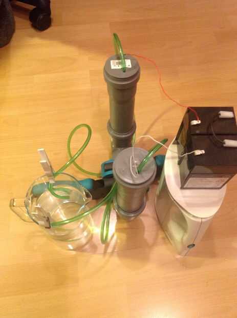 Conecte a la fuente de energía, en este caso una batería de coche y ver cómo empieza a burbujear. Para llenar una botella con el gas lo llene totalmente con agua, luego el tornillo de la tapa de nuevo.