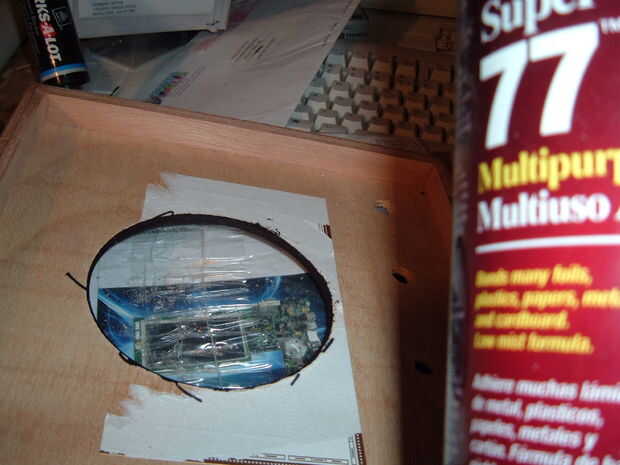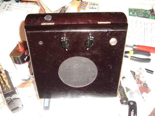 Si usted decide usar un trapo de la altavoz, ahora es el momento de fijarlo. Rocíe una capa de pegamento dentro de la caja alrededor del agujero del altavoz. Cortar un círculo de tela y colocarlo sobre el agujero (en el interior de la caja). Estirar para que se seque bien.