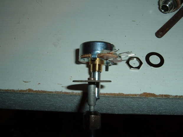A continuación, inserte sus potenciómetros y apriete las tuercas. Utilice una herramienta de corte giratoria para cortar el eje de ajuste pot de 100 ohm. Es demasiado largo. Inserte el jack de entrada y la toma de tensión y apriete las tuercas. Por último, pulse en el titular de LED. Inserte el LED desde el interior y pegamento caliente el LED en su lugar.