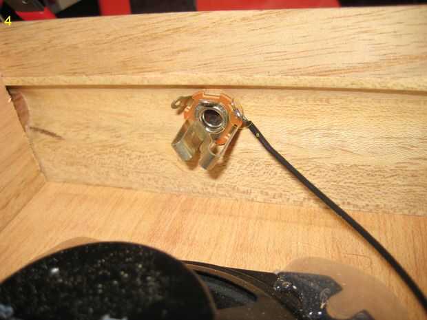 Imagen 12: Suelde el otro extremo del cable negro (F) del cuadro 7 y el otro cable negro (K) al terminal negativo del altavoz. A continuación, suelde el otro extremo del cable largo negro (K) al terminal de anillo de la toma de entrada. Por último, soldar un cable largo amarillo (L) a la terminal de punta de la toma de entrada.