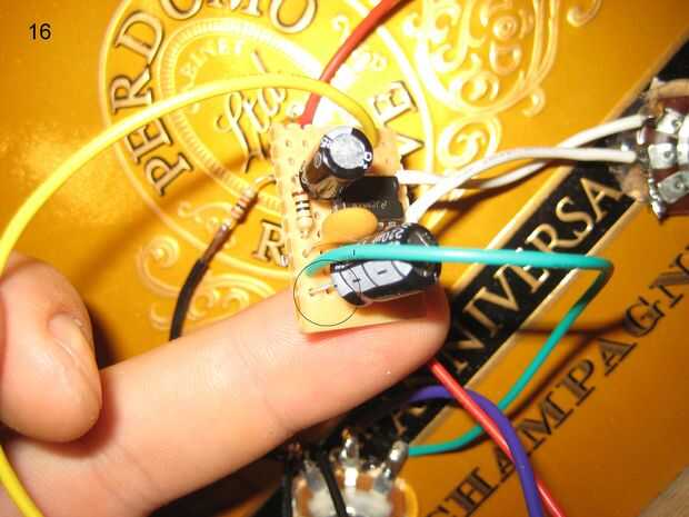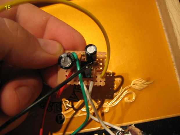 Imagen 16: Suelde el otro extremo del largo verde alambre () del cuadro 10 al extremo negativo del capacitor de 220uF.