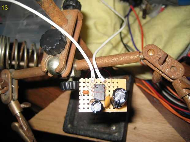Imagen 13: Soldar un cable (M y N) a los pines 1 y 3 del IC LM386-3.