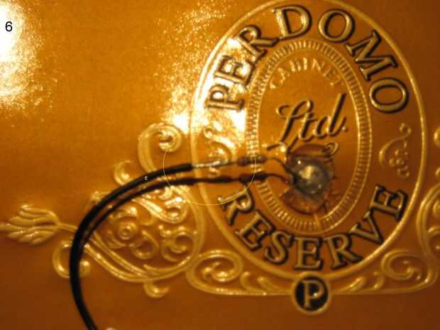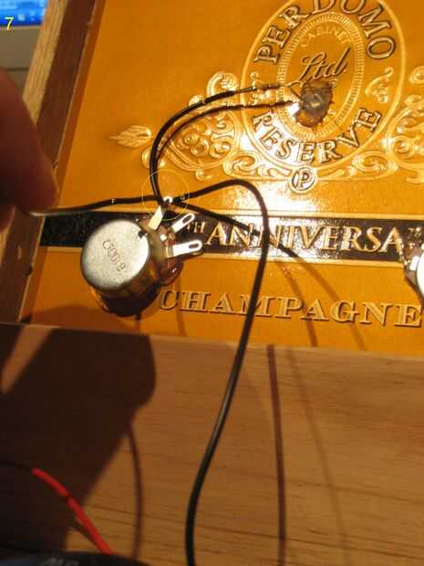 Imagen 7: Recortar el alambre negro largo (E) del cuadro 6 a la tercera terminal de la olla de 100 ohm. Luego soldar dos cables negros largo (F y G) para el mismo contacto. Tomar nota de la orientación de la olla.