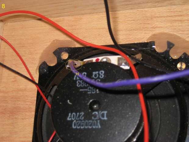 Cuadro 8: Soldar un cable azul (H) al terminal positivo del altavoz.