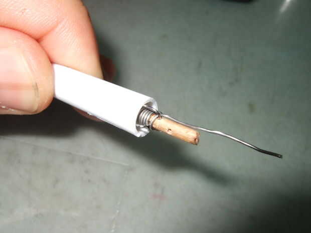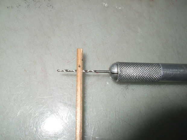 3. Perfore 2 agujeros pequeños totalmente a través de uno de los extremos de la q-Tip. Estos agujeros deben ser lo suficientemente grande como para pasar el alambre de acero. Los agujeros deben ser perpendiculares, y la distancia entre los 2 conjuntos de agujeros debe ser aproximadamente la anchura de la clase de soldadura que se va a cargar en él.