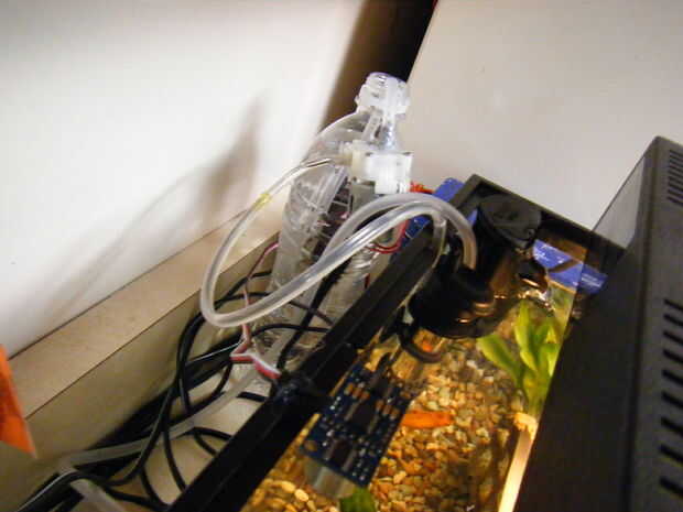 Finalmente, ocultar los cables y empujar el extremo de la manguera de la bomba en el tanque y asegúrelo en la parte superior. Había una pequeña muesca en mi tanque que, creo, está destinado específicamente para estos tubos, por lo que apreté ahí.