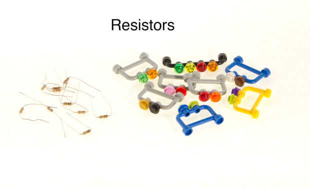 Las resistencias reales están a la izquierda, su Lego resistencias de la derecha.