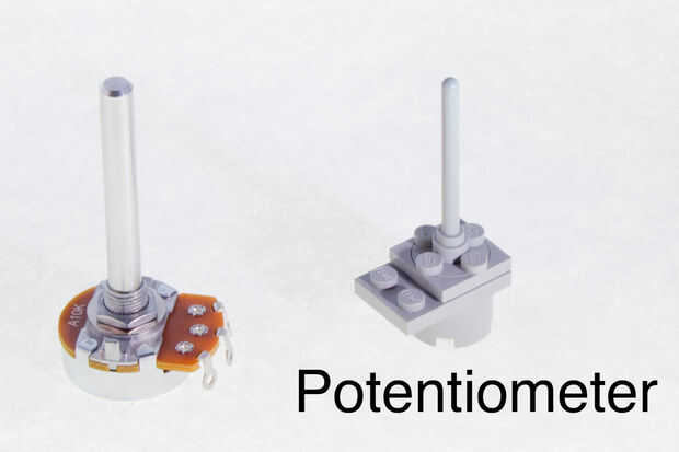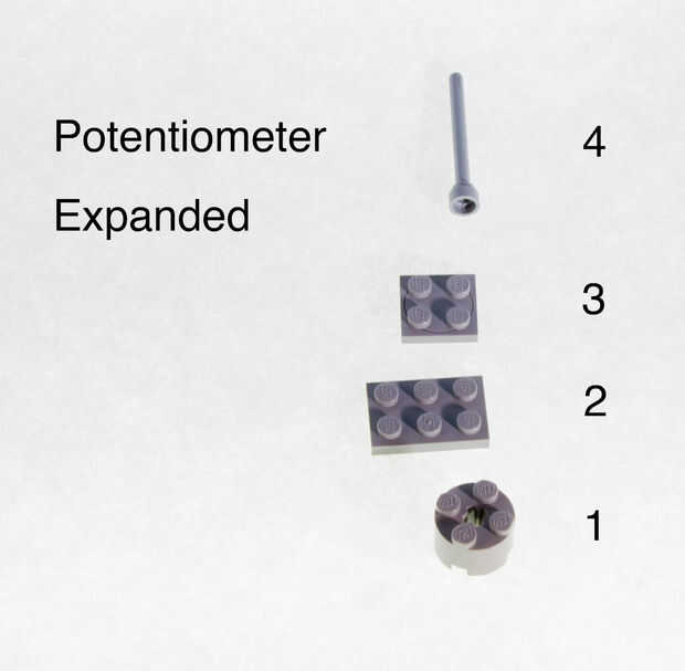 Un potenciómetro real a la izquierda, su versión Lego de la derecha.  También un extendido/despiece donde (1) es el nivel de la parte inferior del componente.