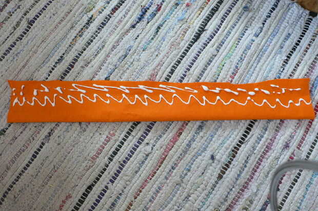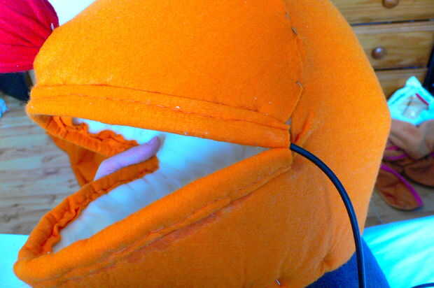 3. a thickin a los labios, que tomé algunos izquierda sobre franjas de fieltro naranja que pegué en medio de thinkness, asegúrese de que sean lo suficientemente largos para envolver la derecha alrededor de los labios. Luego cosí este derecho alrededor de la circunferencia del labio, antes de enhebrar por algunos viejo cable de ethernet para estabilidad a todo. Además cubierto por la apariencia desagradable de las grapas que yo había hecho: P jajaja.