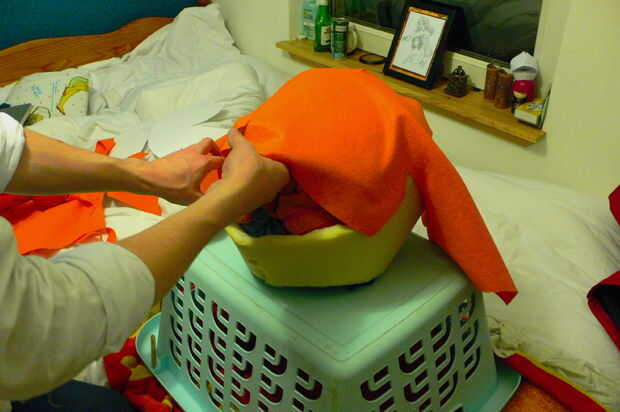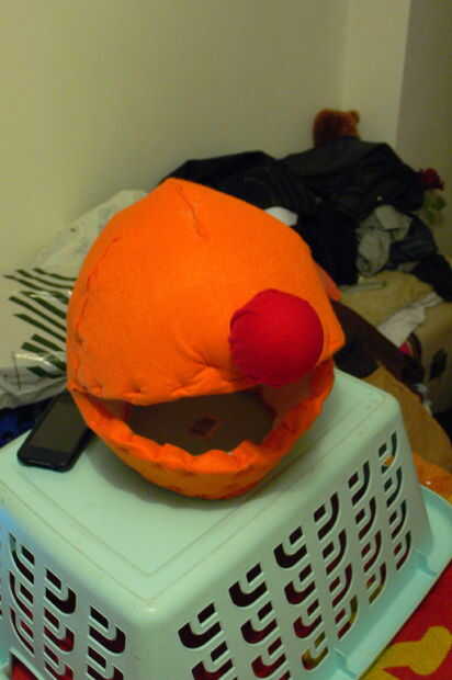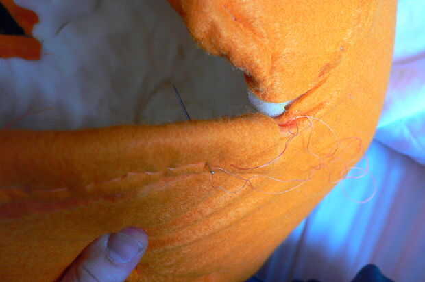 1. el siguiente paso es cubrir toda la cabeza en fieltro naranja. Realmente sería más fácil utilizar naranja paño grueso y suave es el material es más elástico y menos probabilidades de terminar con las arrugas. La mejor opción es utilizar la plantilla (cortan antes) para cortar la misma forma de su fieltro naranja, añadiendo unas pocas pulgadas aquí y allí para el error! Una vez más opté por solo engrape el fieltro a la cabeza de lo Muppet en lugar de pegar, ya que era mucho más rápido y al final del día hay mucho pelo para ir a esta cosa, por lo que cubrirá en tiempo.