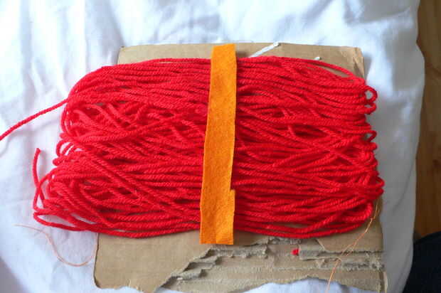1. para obtener el pelo que primero tiré de la tapa de mi caja de cerveza... que necesitará unas cuantas para este paso aunque hará cualquier poco viejas de cartón. Tenía un pedazo grande y uno pequeño para más cortas mechones de pelo en la barba y la corona de la cabeza, pero otra vez no dude en probar de otras maneras. Simplemente Envuelva la lana roja alrededor de la cartulina de 30/40 veces el sacar lo que tiene y cose una tira naranja de fieltro por el medio. Una vez que exitosamente sewin el fieltro de las lanas, cortar todos los lazos ambos lados de la misma logrando así el cabello. He incluido una buena pocos fotos en cómo esto se hace y potencialmente debe buscar.
