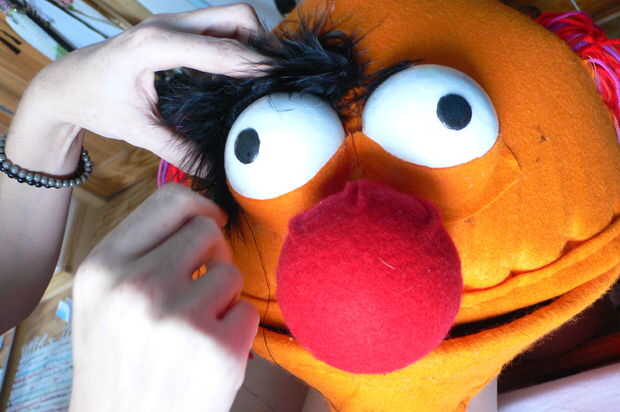 3. las cejas corte una boa de plumas a la mitad y doblar las franjas cortadas por la mitad otra vez para thickin'. Luego cosí sobre cada ceja justo encima de cada ojo, cosiendo directamente sobre la máscara. Sólo añadí como una puntada cada lado de la ceja para que la boa de plumas tenían espacio para moverse y dar ese aspecto Animal loco.