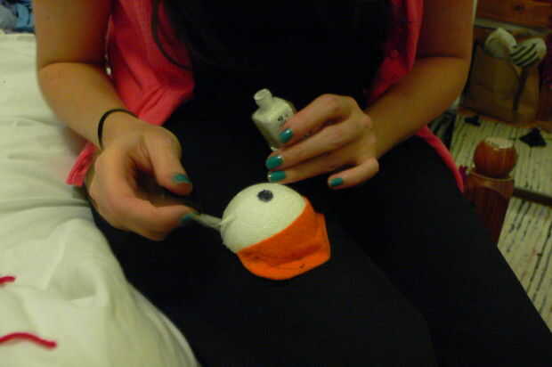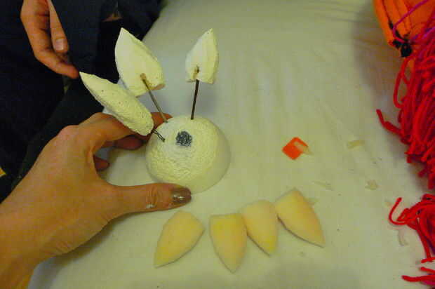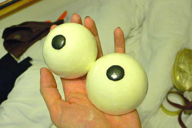 2. para los ojos otra vez tomé algunos sobrantes de fieltro naranja que pegué al fondo de ellos para crear un párpado. Yo sin embargo pintado blanco dándoles unos 3/4 capas para realmente darles un aspecto irreal, primero pegado en dos circulares negros ojos sentíamos que había cortado antes. Para conseguir el brillo en ellos utiliza film transparente envuelto apretadamente alrededor de cada ojo, aunque estoy seguro de que hay tal vez otras maneras de lograrlo. Os adjunto los ojos a la cara pegando super el párpado inferior que había conectado directamente a la máscara. Toma un poco de hacer conseguir el derecho de la posición de los ojos, pero sólo mantener Movin ' les sobre sujetándolas con agujas hasta que estés feliz.