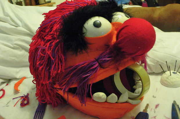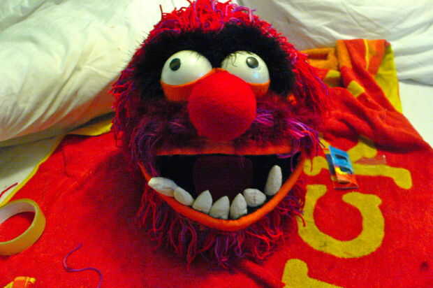 Toques finales: Para cubrir cualquier costura que había hecho y las tiras de fieltro naranja a lo largo del labio me arrancó de puñados de boa de plumas color carmesí y había pegado en su lugar, esto realmente funcionó bastante bien para dar la barba un aspecto más Animal. Una vez que el pegamento se haya secado pop en la cabeza de Muppet y sentarse detrás y disfrutar de tu obra maestra!
