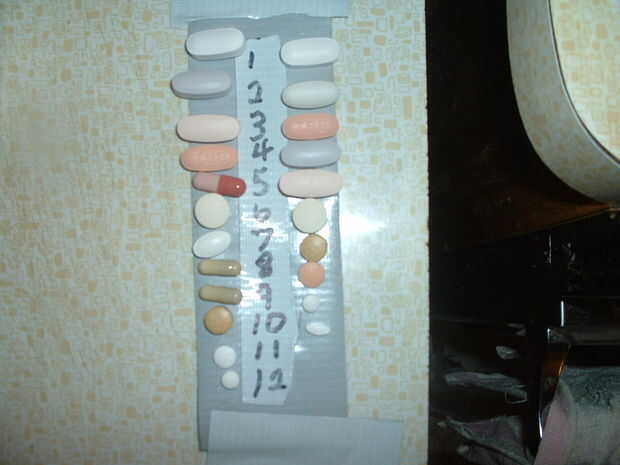 Paso # 1. Primero tenía que encontrar justo lo que estaba tomando y cuantas. Mi esposa tenía las pastillas en las bolsitas con mañana y noche. Así que terminé quitando las pastillas de la bolsa mañana y he intentado alinear para que pudiera tomar una foto de ellos. Esto lo hice sin ninguna suerte. Mi siguiente pensamiento fue tal vez que podría utilizar un pedazo de cinta adhesiva. Me volví a ambos extremos de la cinta para que se pegue abajo en el protoboard. Hice otro pedazo de cinta con los números del 1 al 12 como se aprecia en la imagen siguiente.
