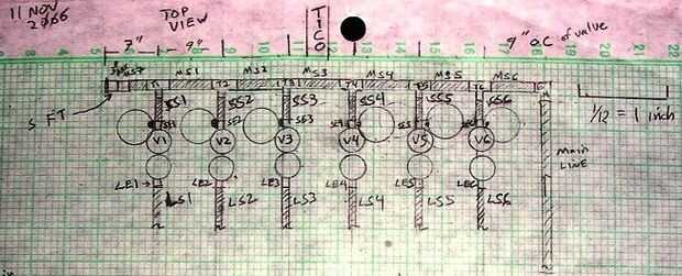 La primera idea es llevar las válvulas como cerca de una pared como sea posible pero todavía permitir espacio para trabajar en las válvulas. Me llevó a diseñar un colector línea recta funcionamiento con deslizamiento Ts en perpendicular 90° al colector principal de ejecutar. Aquí he etiquetado como el tubo de MSn donde MS significa lado colector, y n es uno de los números enteros 1-7. También he etiquetado el resbalón Ts T 1-6, que corresponde con uno de cada una de las válvulas. En el lado de la entrada del colector es codo EM, para codo colector, y en el lado opuesto tengo un deslizamiento al conector hembra de rosca etiquetada SFT, supongo que por deslizamiento del hilo de rosca femenino.