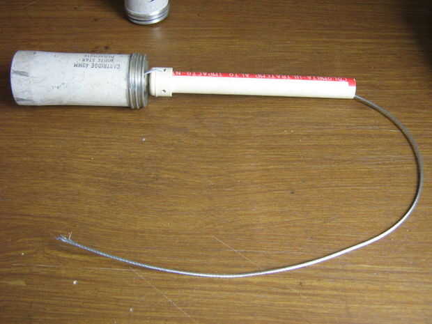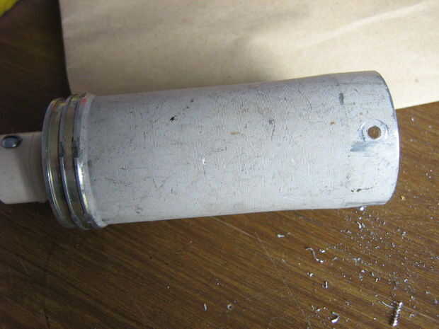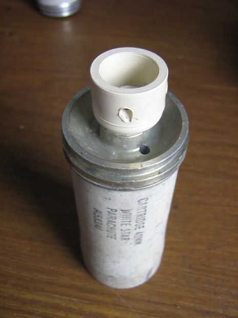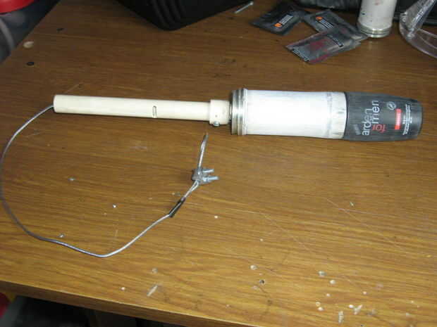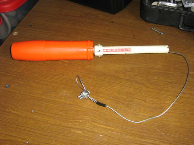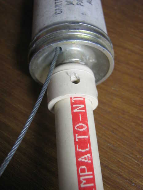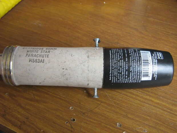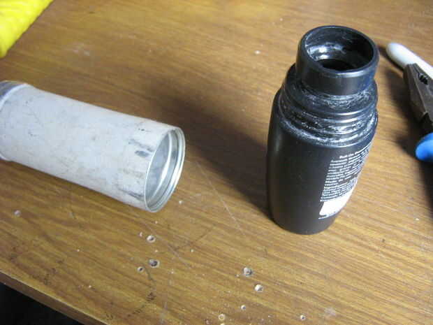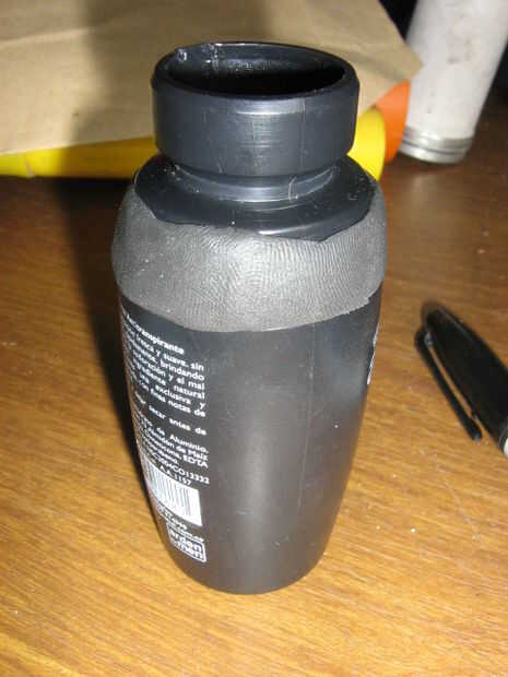 Ajustar la botella de plástico en la caja de aluminio. Porque el objetivo principal de esta arma es para rescate acuático, el proyectil debe ser hermético. Uso de SUGRU para sellar los agujeros y espacios entre caja y botella. Ajustar y fijar con tornillos. Pintada de naranja el proyectil porque destaca.