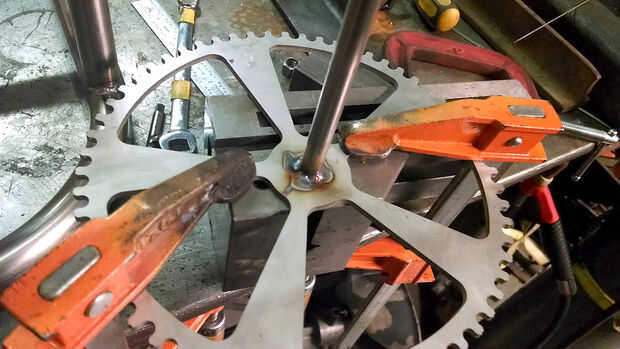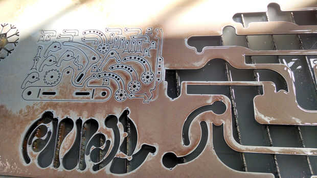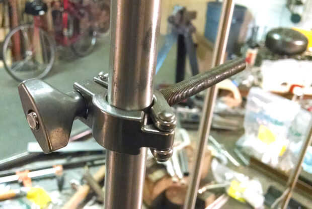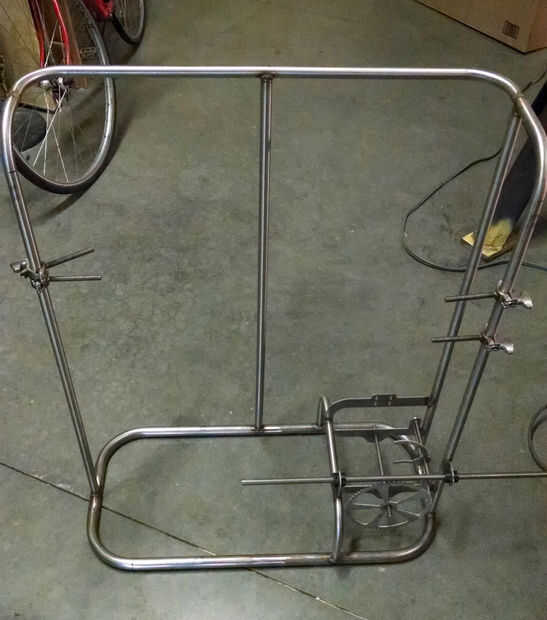 Comencé a construir el armazón mientras que todavía estaba concibiendo y diseñando piezas. Tuve acceso a una agradable mesa de Omax 5 ejes por chorro de agua, así que comencé a cortar las partes hacia fuera y pedir más hardware. Compré el tubo inoxidable de 3/4" y 1" diámetro 304 y esquinas dobladas y soldadas al marco (ver imagen), incluyendo la esquina en la parte inferior derecha donde están las piezas de accionamiento. Soldar varillas roscadas a la las abrazaderas de montaje de tubo para unir los módulos al marco. Las pinzas permiten piezas fácilmente movido alrededor y ajustarse.