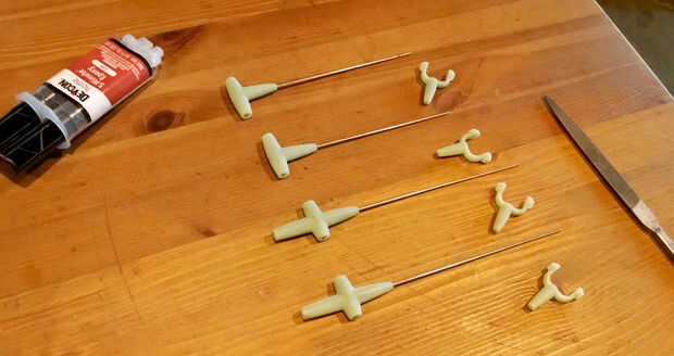 El brazo de contrapeso y el brazo de bloqueo tienen pesas suspendidas, así como de otras partes de alambre de metal pequeña para reducir la fricción cuando se frotan uno contra el otro. Perforado y golpeado ligeramente las piezas impresas 3D para varillas roscadas sujetar los pesos. Terminé de soldar las tuercas de latón moleteada en barras roscadas para soportar el peso y el poco gancho en el brazo de bloqueo.