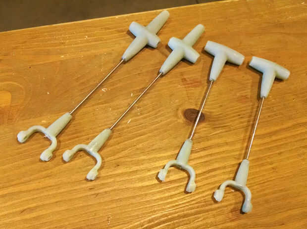 3D imprimí muchos de los pequeños componentes de los módulos de colada en un Objet Connex 500 en ABS-como el material (para fuerza). Usé varilla inoxidable ajustaron en accesorios 3D impreso tee para crear el arreglo de cuatro barras que vertería el receptáculo.