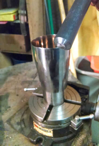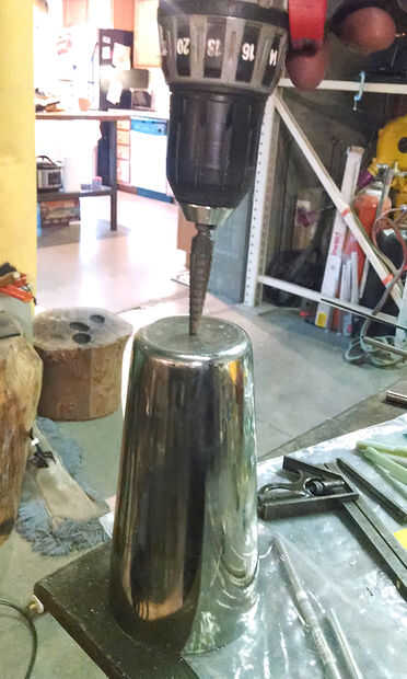 Luego perforar el fondo de la taza de la coctelera y una herramienta para flare el agujero para la colocación de cabeza avellanada. He añadido un pedazo delgado de silicona como junta entre la taza y la parte avellanada y cuando lo fue hermética! Perfecto.