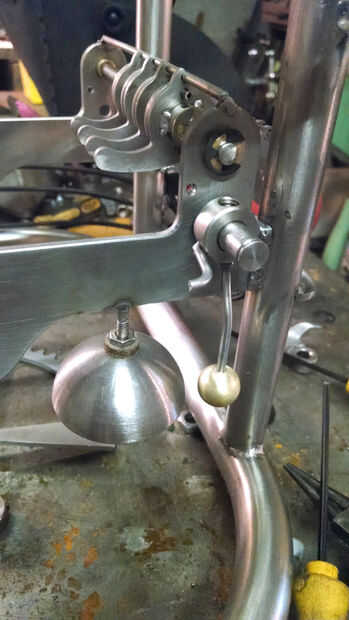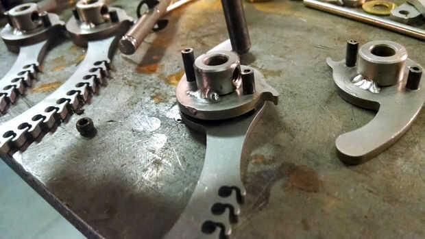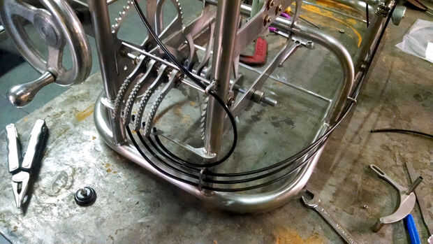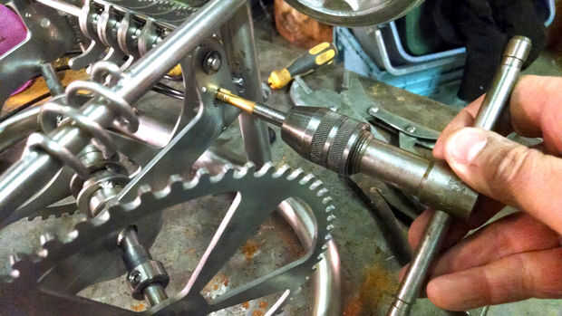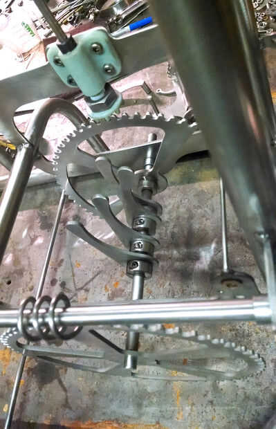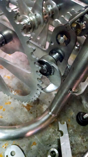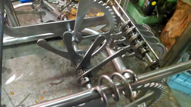 La máquina entera se funciona girando una manivela en la esquina inferior derecha. La manivela convierte en un gusano, el gusano conduce un engranaje, el engranaje de gusano se une a un eje. En ese eje se sientan cuatro levas y un engranaje parcial. Las levas son sólo afianzado con abrazadera en el eje, para que puedan cambiar y ajustar fácilmente. Cuando cada leva viene alrededor de la parte superior de su trayectoria, empuja una palanca. La palanca tira un cable, que los paseos dentro de un tubo a uno de los módulos, donde tira de cualquiera que sea parte activa de ese módulo.