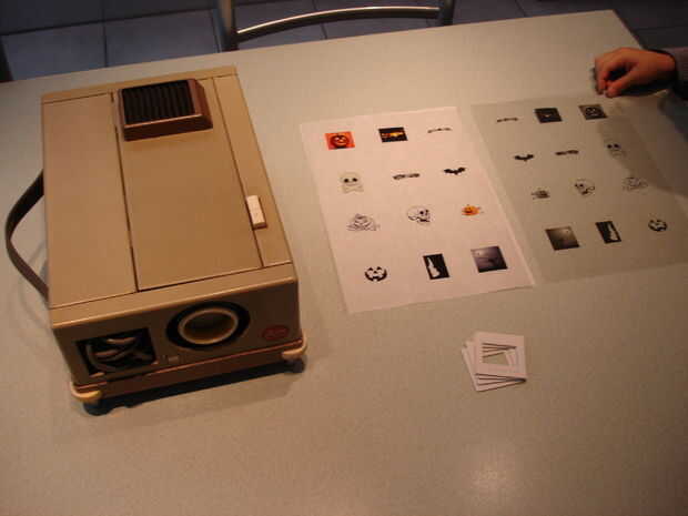 Usé mi viejo proyector de diapositivas Leica que apareció en el ático. Pensé que sería impresionante para proyectar algunas fotos de la calabaza en la pared de la casa durante la noche de Halloween. Y me funciono muy bien!