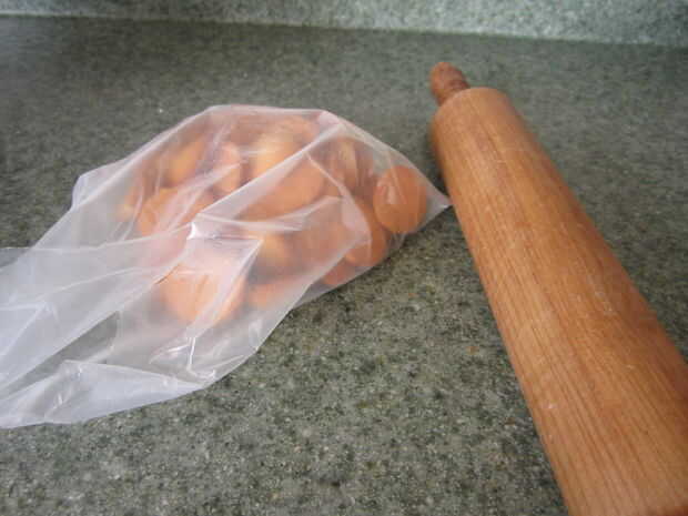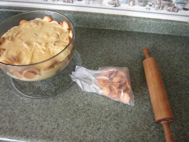 Para la parte superior, aplastar algunas obleas de vainilla en la bolsa con el rodillo (o lo que funciona para aplastarlos).