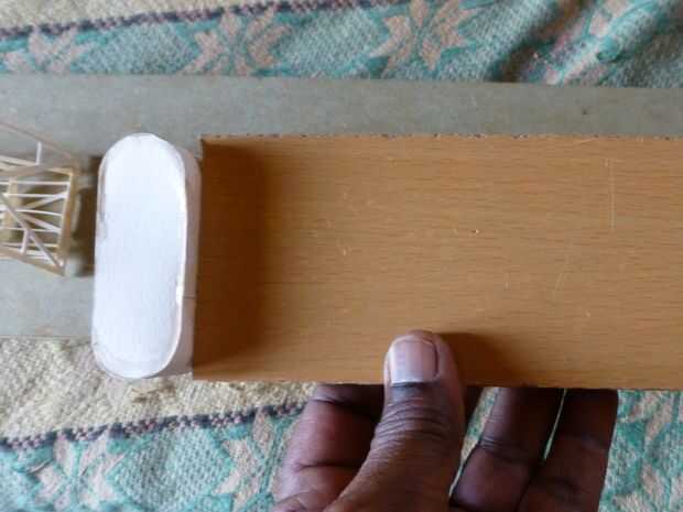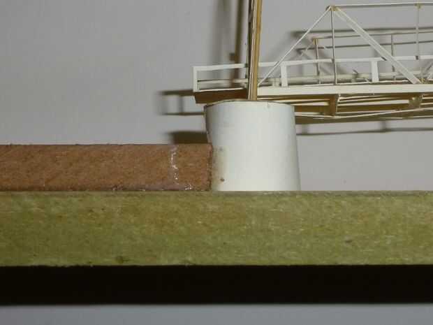 Los extremos de los tramos finales y torres descansan sobre pilares de hormigón. Aquí he hice la forma del muelle escala y pegado alrededor de los lados con papel. Los muelles terminados pueden fijarse a los lados de cualquier soporte firme como la pieza del tablero de la prensa que he usado aquí