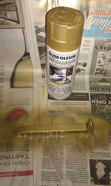 Esto toma mucho tiempo si quieres que se vea bonito en primer lugar lavar y secar la espiga luego aplique una capa delgada de pintura en aerosol oro y esperar 24 horas (dijo que tomaría un largo tiempo) entonces haz un scotch brite cojín (o cualquier esponja de fregar) y arena la pintura trabajo muy ligeramente ahora aplique otra capa de pintura en aerosol y esperar 24 horas y arena otra vez repetir hasta conseguir el acabado deseado ( pero no lije la última capa muy importante) entonces algunos spraypaint claro y añadir una capa protectora clara para el punto entero.