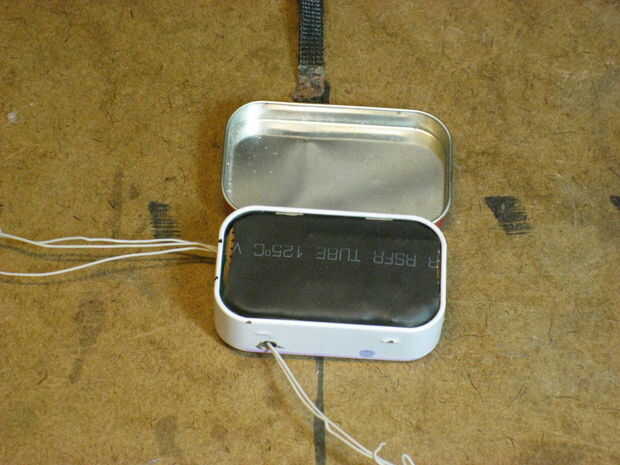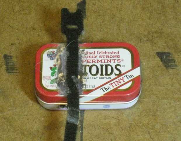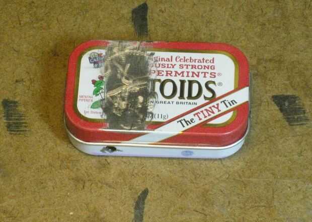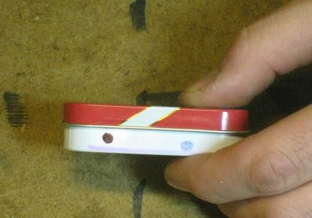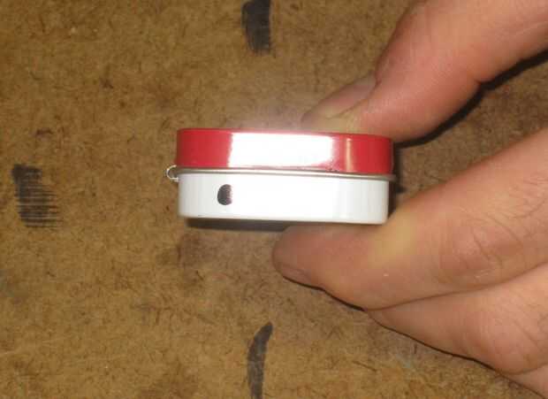 Marque el agujero del botón de anillo en la lata Altoids. La bisagra debe estar a su izquierda. Perforar hacia fuera, uso la Dremel y un accesorio de pulir para quitar los puntiagudos y presentar bordes afilados.