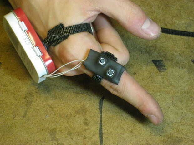 Vuelva a colocar el tirador de punto y encontrar una posición para el botón de la palma. Cuando usted hace un gesto señalando, intuitivamente debe pulsar el botón. Marcar ese lugar, sacar el tirador del punto y asegurar el botón en su lugar con pegamento caliente. Virar hacia abajo de los cables con otra gota.