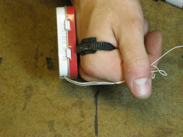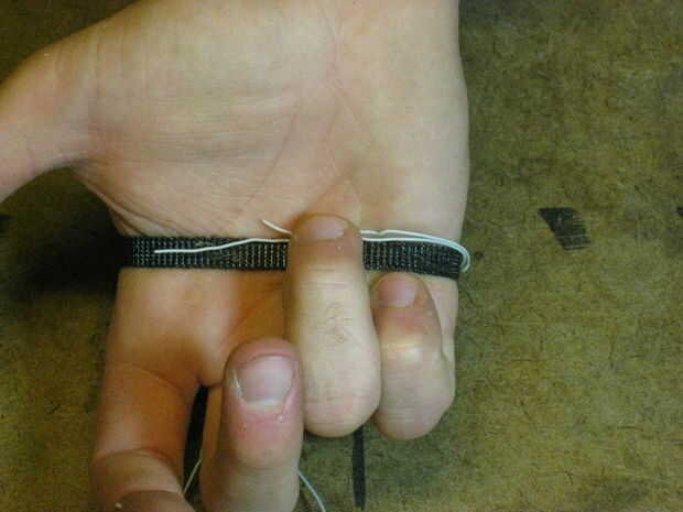 Hacer un puño y guiar libremente los cables del botón de anillo en la parte posterior de su mano y sobre su nudillo. Corte como se muestra, no cuando van en el primer empalme del dedo indicador. Los extremos de la tira.