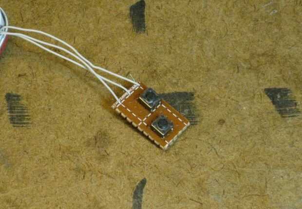 Ajuste de los interruptores táctiles a la Veroboard otra como se muestra y soldadura en el lugar. Soldar el cable de tierra con el centro, el cable del Pin 6 por lo que se conecta al botón más cercano y el cable del Pin 7 por lo que conecta con el otro botón. Reforzar el punto donde tocan la Veroboard con pegamento caliente.