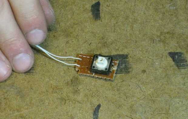 Ajustar el interruptor táctil grande en uno Veroboard como se muestra y soldadura en lugar, luego de la soldadura de los cables del botón de Palma. Reforzar el punto donde los cables tocan la Veroboard con pegamento caliente.