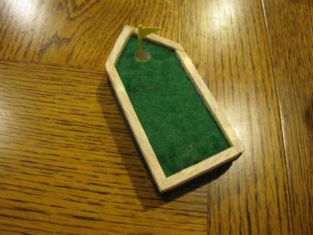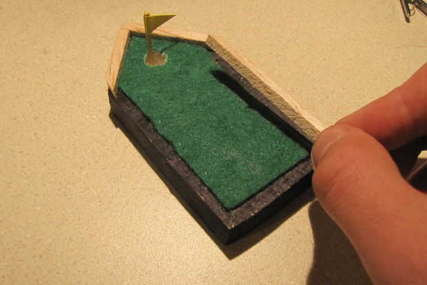 Ribete en el curso es necesario para evitar que la pelota de golf pequeña volando a través del cuarto. A menos que le gustaría correr por el comedor buscando debajo de las mesas de bolas de golf pequeña! El ribete que utilizamos en este proyecto es la tira de madera de balsa cuadrada de 1/4 de pulgada. Estas tiras de madera eran aproximadamente 3 pies de largo para comenzar con y luego fueron cortadas al tamaño correcto. Utilizando una sierra de dientes finos, como los de un sistema exacto del cuchillo, corte la madera de balsa es muy simple. Alinee la tira de madera con campo de golf y cortar secciones que encajan en la base. Corte las secciones de madera ligeramente más largo que necesitan ser por lo que puede lijar al tamaño exacto necesario. Una vez que se han cortado todas las secciones, comenzar pegando en su lugar con pegamento de madera. Para asegurar que el borde permanece en su lugar durante el pegado, puede utilizar bandas de goma para asegurar las piezas. Una vez que todas las piezas de borde han pegado en su lugar, continuar el proyecto por medio del llavero.