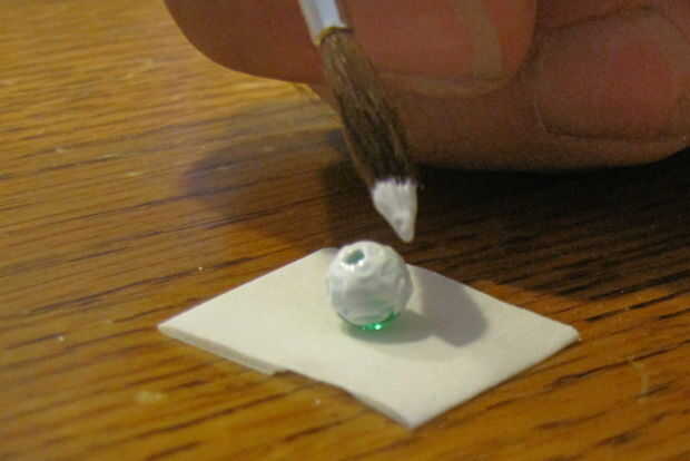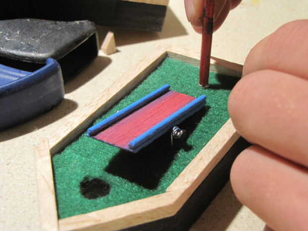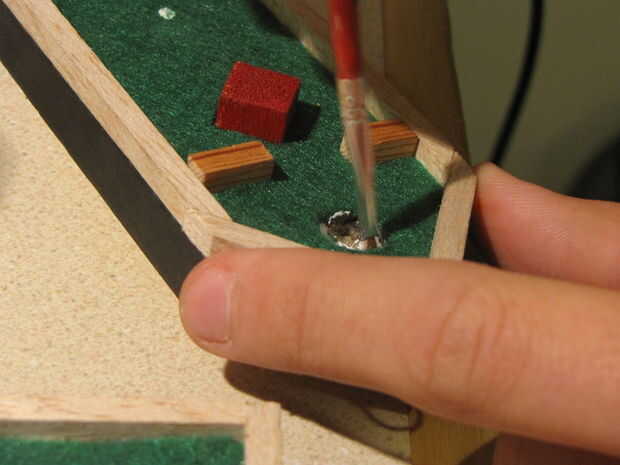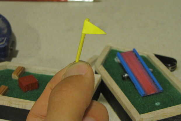 Los pocos toques son simples pasos que agregar mucho carácter en el campo de golf. Estos toques son pintura el punto de partida, el agujero de la pintura, haciendo la bandera y pintar la pelota de golf. El punto de partida es donde la bola se coloca al comienzo de cada agujero. Esto se hace sumergiendo el extremo de un pincel en pintura blanca y luego la untar sobre el fieltro. El interior del agujero entonces está pintado de blanco. La bandera amarilla que va en el agujero es también muy divertido para construir. Un palillo de dientes se corta a aproximadamente 1 pulgada de longitud. También, dos triángulos isósceles que son 1/2 pulgada de largo y 1/4 pulgada de ancho se cortan del papel. Aplicar caliente-derrite el pegamento sobre uno de los triángulos y presiona el otro triángulo en la parte superior. A continuación, con un cuchillo del exacto corte hacia la parte posterior del pegamento caliente el diámetro del palillo de dientes. Doble estas aletas apartes y, a continuación, deslice la pieza de palillo de dientes en la apertura. Otra vez con pegamento caliente, fije los triángulos de papel en el palillo de dientes. Pintar la estructura de toda bandera amarillo limón. Por último pegar la bandera en su lugar en la parte posterior el orificio de entrada. El broche final para completar es pintar la pelota de golf blanca. Esto se logra mejor usando cinta para sostener la bola en su lugar y aplicando finas capas de pintura blanca hasta que la bola ha sido totalmente cubierta. Taponando la pintura se pueden replicar los hoyuelos de las pelotas de golf reales. Una vez que haya completado estos pasos, pasar el paso último, personalizar el curso.