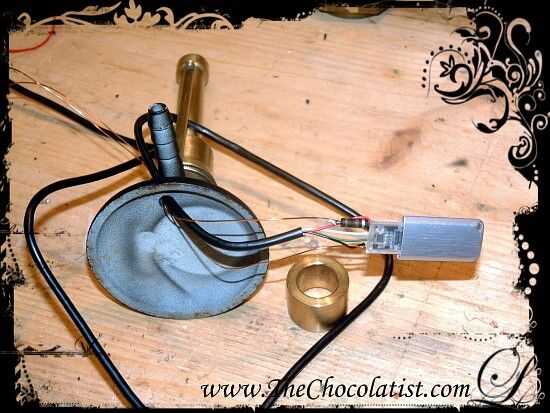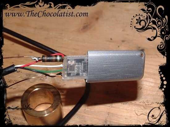 taladré un agujero para el cable en el soporte de la hornilla. Luego soldar el cable USB a la memory stick y conectado el resistor y los hilos de cobre para el LED, que planeé para montar en la parte superior del tubo de vacío.