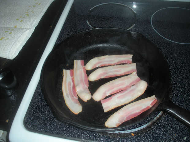 Yo estoy cocinando en casa de mis hijas y su sartén de hierro fundido funciona mejor si el tocino se corta en medio, cocine el tocino en la medida en que su familia prefiere