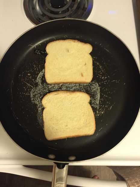 • Lugar el pan en la sartén con el lado untado de mantequilla hacia abajo.