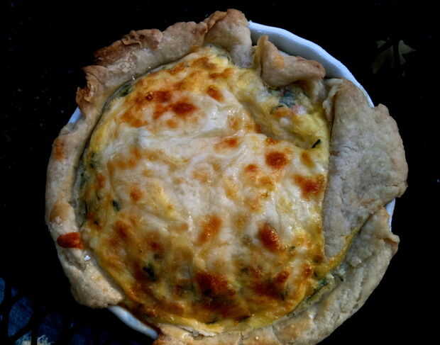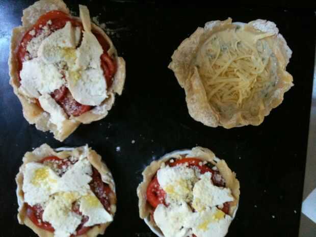Coloque la cebolla saltear en el fondo de la concha, rellenar con la mezcla de huevo sobre a mitad de camino, entonces uniformemente spread los tomates en rodajas en una circular del patrón junto con trozos de albahaca y luego terminar con la mozzarella fresca en rodajas y picar en trozos grandes rallado queso Romano.