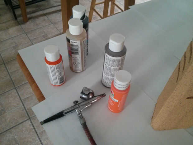 Para mi trabajo de detalle, utilicé mi aerógrafo y algunas pinturas acrílicas básicas. Generalmente mezclé mi relación de agua/pintura en cerca de 20-1, lo que es extremadamente delgada. Los colores que usé eran marrón, tan, negro y naranja. Brown fue utilizado dentro de las ranuras para oscurecerlos y darles contraste con pequeños tonos abajo de la piedra. El negro usé alrededor de la base de las piedras y alrededor de sus centros donde se celebraría por manos sucias. Entonces les di una explosión general claro con la naranja para hacer que parezca un poco más de arena del desierto, a continuación, el bronceado, para mezclar todo junto.