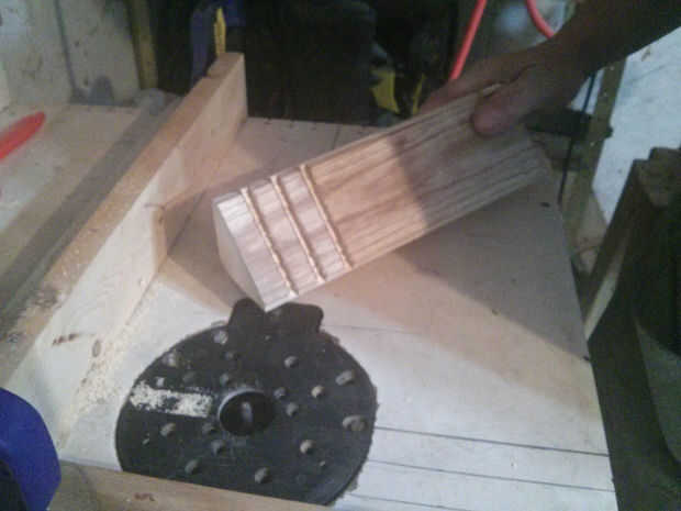 La piedra de la tierra fue el más fácil de todos. El mejor lugar para comenzar es con los cortes traseros ya que van a través de todo el camino. Con el router en la tabla, he instalado el 1/4" bits y ajustado a una profundidad de corte de 1/4". Luego se trasladó la Guardia trasera 4" de la punta creando un pequeño. 5" la brecha entre la pieza y la cuchilla. A continuación he marcado directamente sobre la mesa una línea funcionando 45 grados a la guardia y pasar directamente a través del centro de la broca. A partir de ahí marqué 6 líneas adicionales a la izquierda y 6 más a la derecha de la línea central, en el espaciamiento entre ellos de 7/8". Esto crearía la distancia, en el centro de cada una de las ranuras en la piedra.