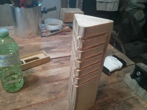La forma en que funciona es, por un borde recto a lo largo de las líneas de sujeción, se puede establecer una plantilla de guía que le ayudará a cortar canales simétricos mientras dibuja la piedra hacia usted. La razón de esto es que es fácil de crear una línea recta tirando hacia usted que empujando lejos. Para la parte posterior, que va trabajando sólo con las 6 líneas a la izquierda de centro. Configurar la barra de guía en la primera línea a la izquierda del centro y tirando hacia usted, tallar el canal. Mueva la uno línea de barra guía y repetir. Continúe hasta que todas las líneas de 6 han sido creadas.