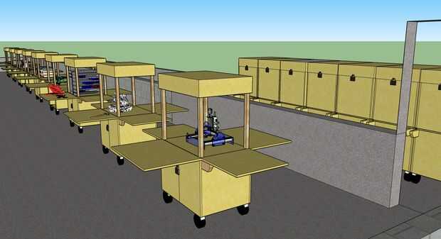 En makerspace, estos son importantes porque son capaces de diferentes actividades de grupo por unidad de despliegue, en lugar de ubicación, por lo que somos capaces de utilizar y reutilizar un espacio de trabajo común para muchas actividades diferentes, solo por sacar una caja diferente y desembalarlo. 8 Ramen empacar en cerca de 100 pies cuadrados, pero puede expandirse para llenar casi 2000 pies cuadrados, si les tira todo a la vez. Un ejército de Ramen soportes llevará a cabo todas las cosas!