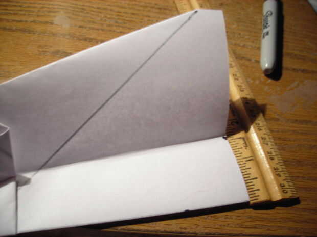 2. Mida 1 1/4 pulgadas de la btoom vuelta de esquina del plano. Marca este punto, ya que es donde el ala va a necesitar doble a. Doblar el otro lado usando la primera ala que dobla como una referencia. (Cuadros 2 y 3)